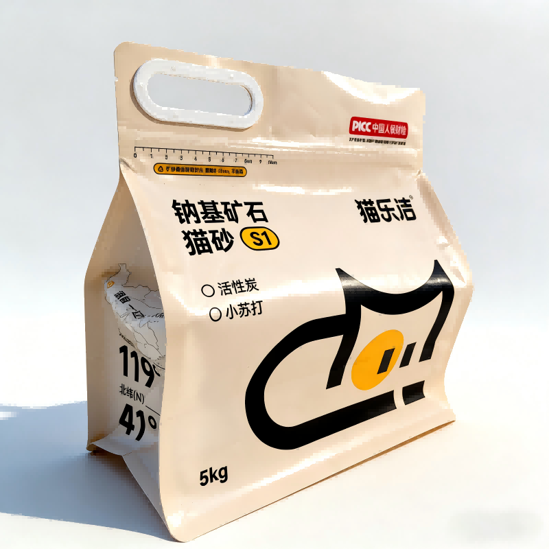 Осумстраната заптивна структура ја одржува торбата стабилна и исправена, идеална за истакнати прикази на полиците. Исто така, го олеснува стабилното редење и практичното складирање. Рачката на патент обезбедува сигурно и сигурно затворање, спречувајќи влага и прашина да навлезат дури и со постојано отворање и затворање. Понатаму, дизајнот на зајакната пластична рачка овозможува лесно ракување со 5 килограми ѓубре за мачки, што го подобрува корисничкото искуство.